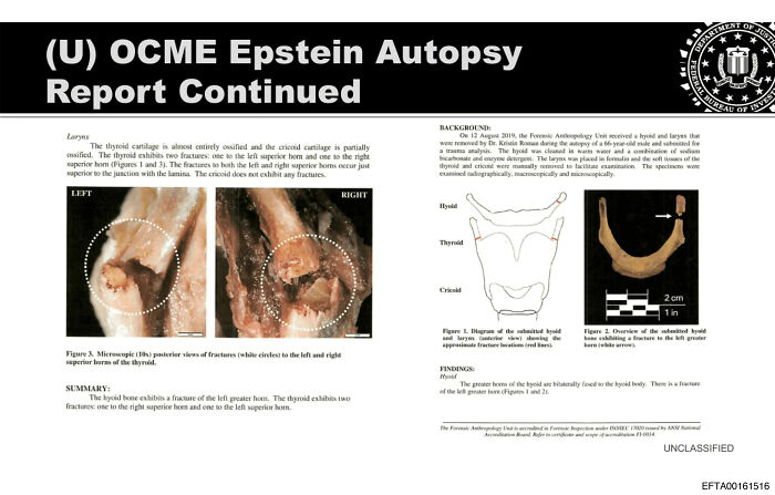 - Epstein’s autopsy revealed a fractured thyroid cartilage, fueling conspiracy theories about potential strangulation.