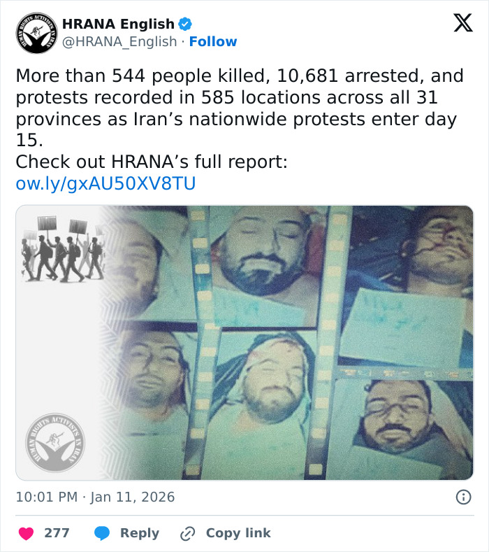 According to non-profit human rights activists in Iran, more than 544 people have been killed and 10,681 have been arrested as nationwide protests swept across 31 provinces.